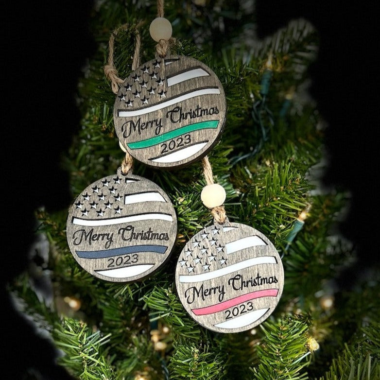 This stylish ornament is the perfect tribute to police, firefighters, and military personnel. The blue stripes in the flag represent police and the red stripe represents firefighters respectively, while the green stripe honors the armed forces. Additionally, there is a plane white striped flag for those who want a classic patriotic piece. This ornament is made from birch plywood and finished with black stain and a whiteboard background.