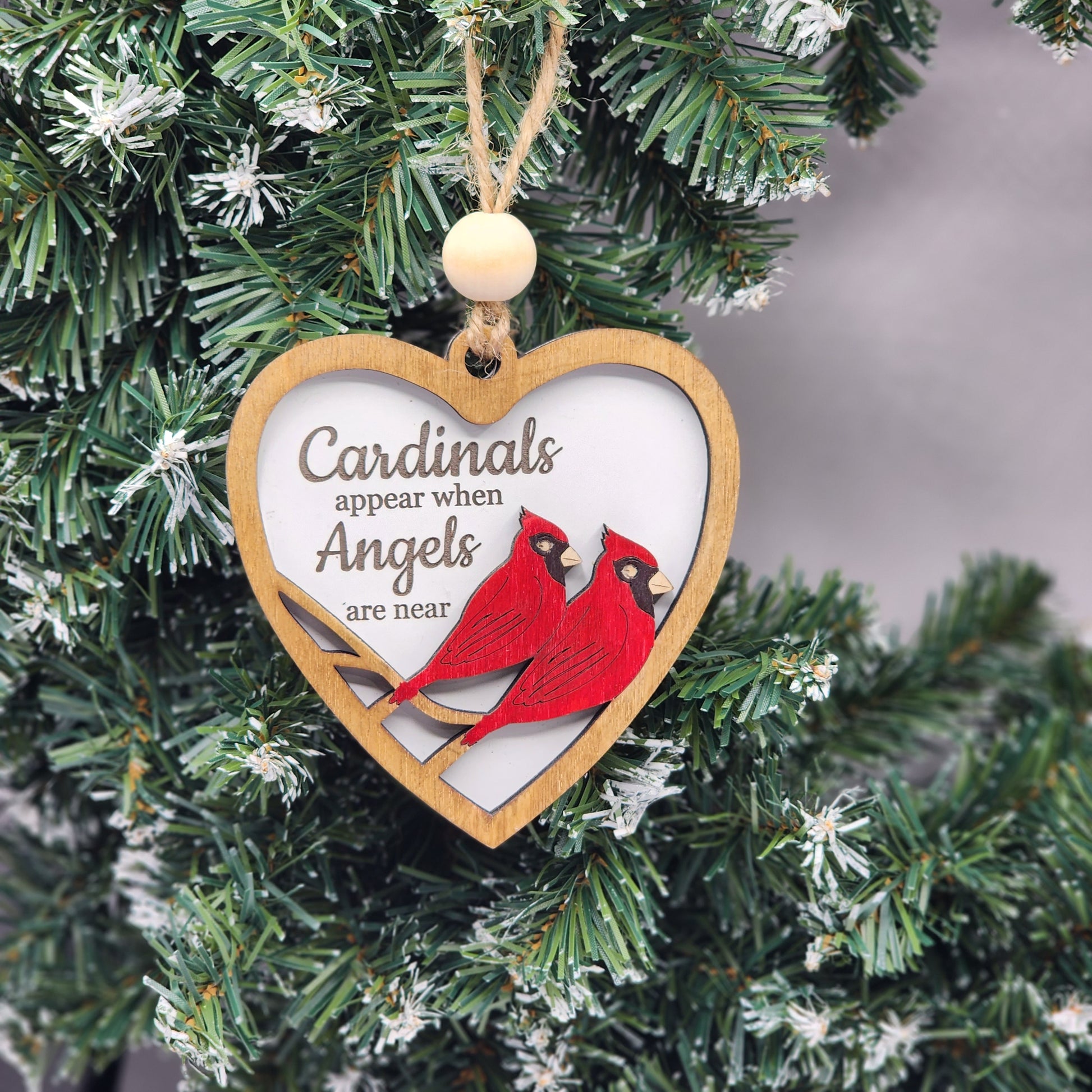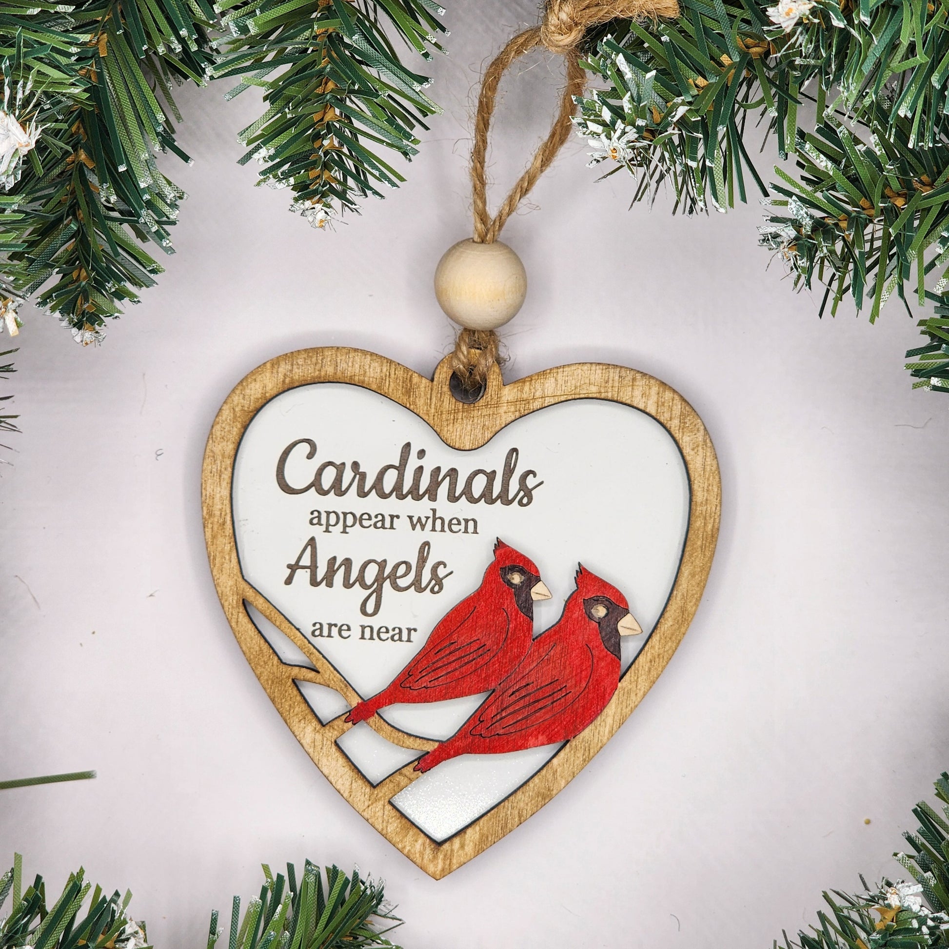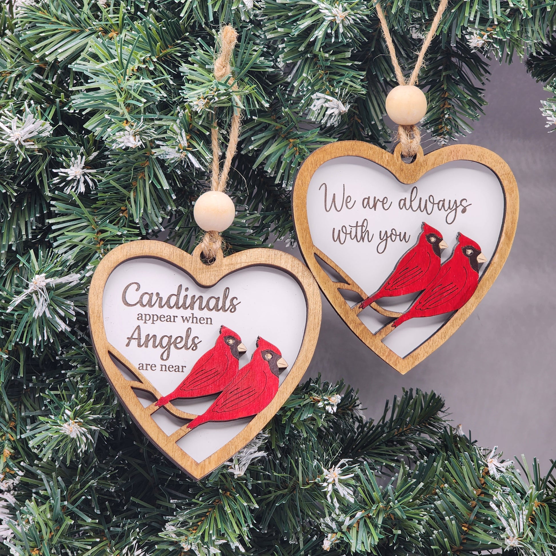 A handmade memorial ornament with the option of having it say “I am always with you” or “Cardinals appear when angels are near". This is a way to celebrate the life of a loved one and would make a thoughtful gift for someone who may have lost someone close to them. They say that Cardinals can remind you of a departed loved one and are known as the most notable messenger. The ornament is laser cut, engraved, and lightly sanded to give a clean look. The Cardinal is red and the rest of the front face is stained with a mission oak. The back plate is made of white board.