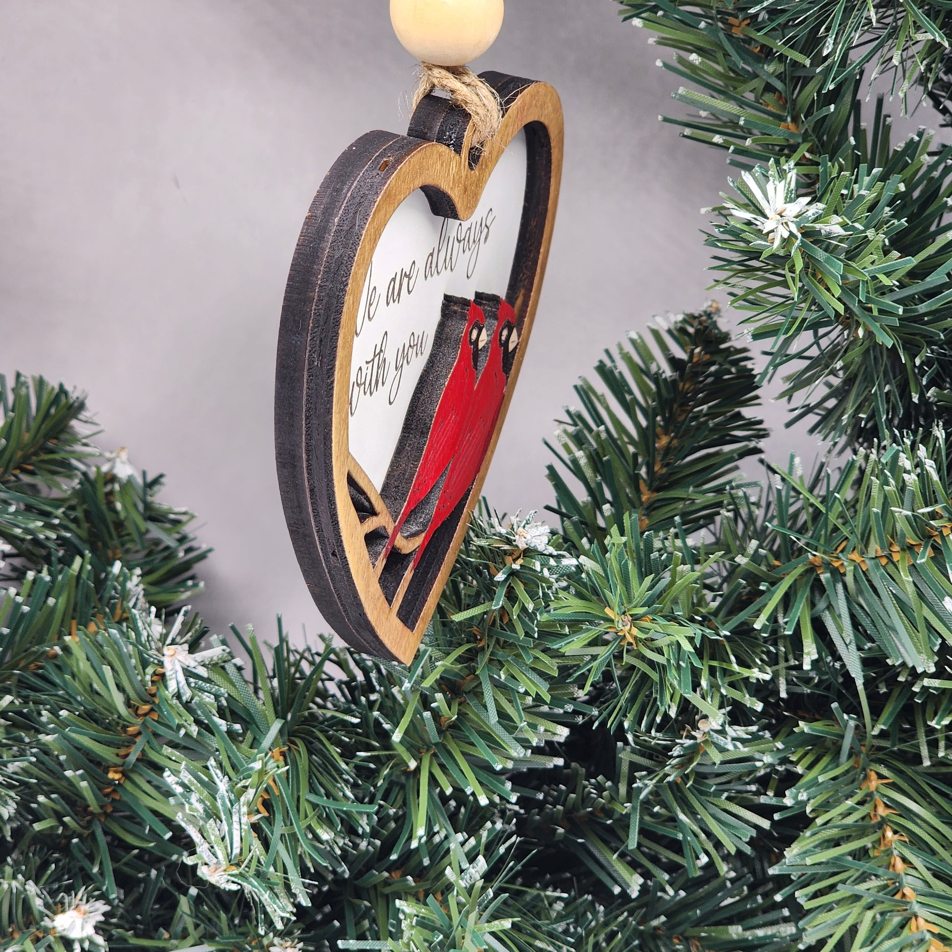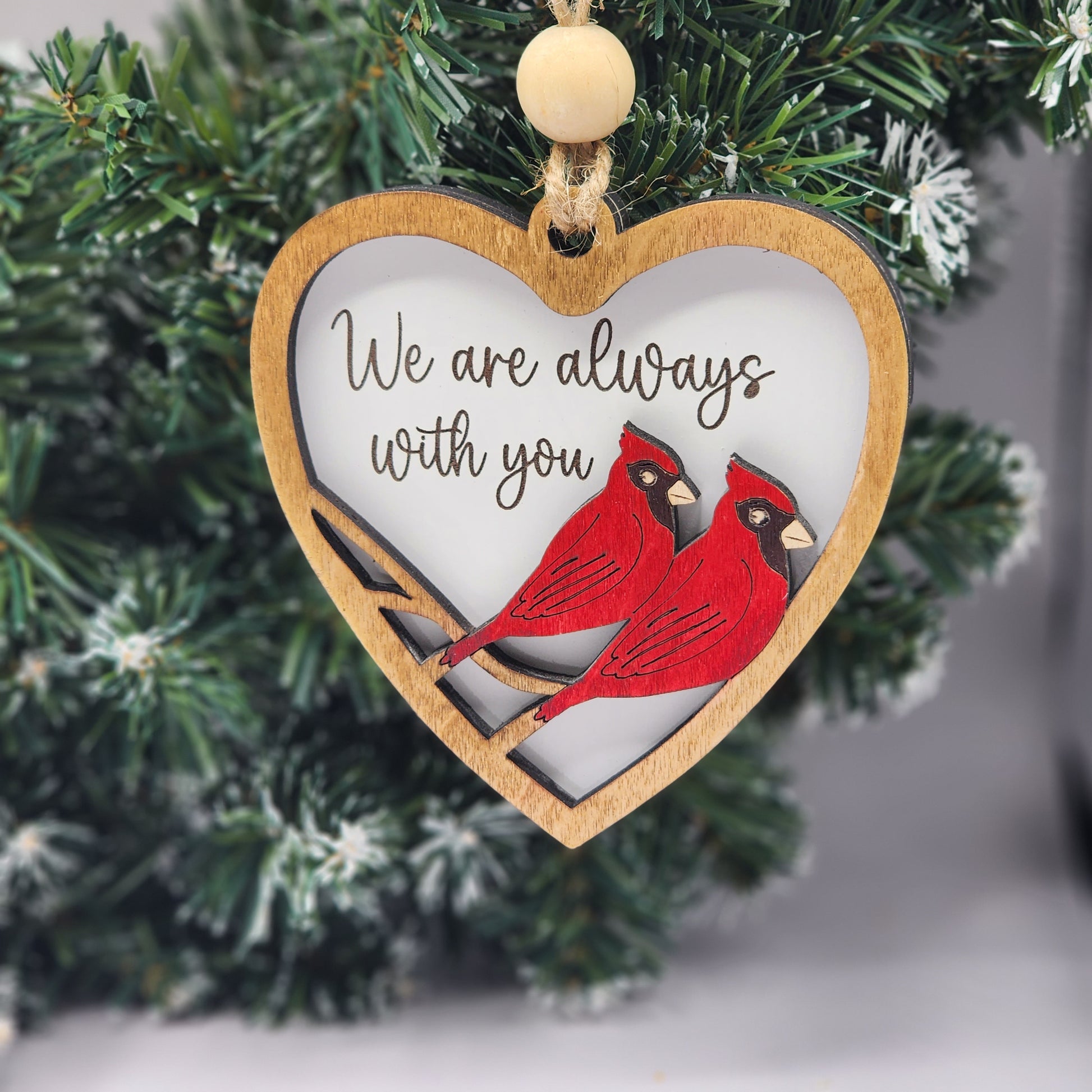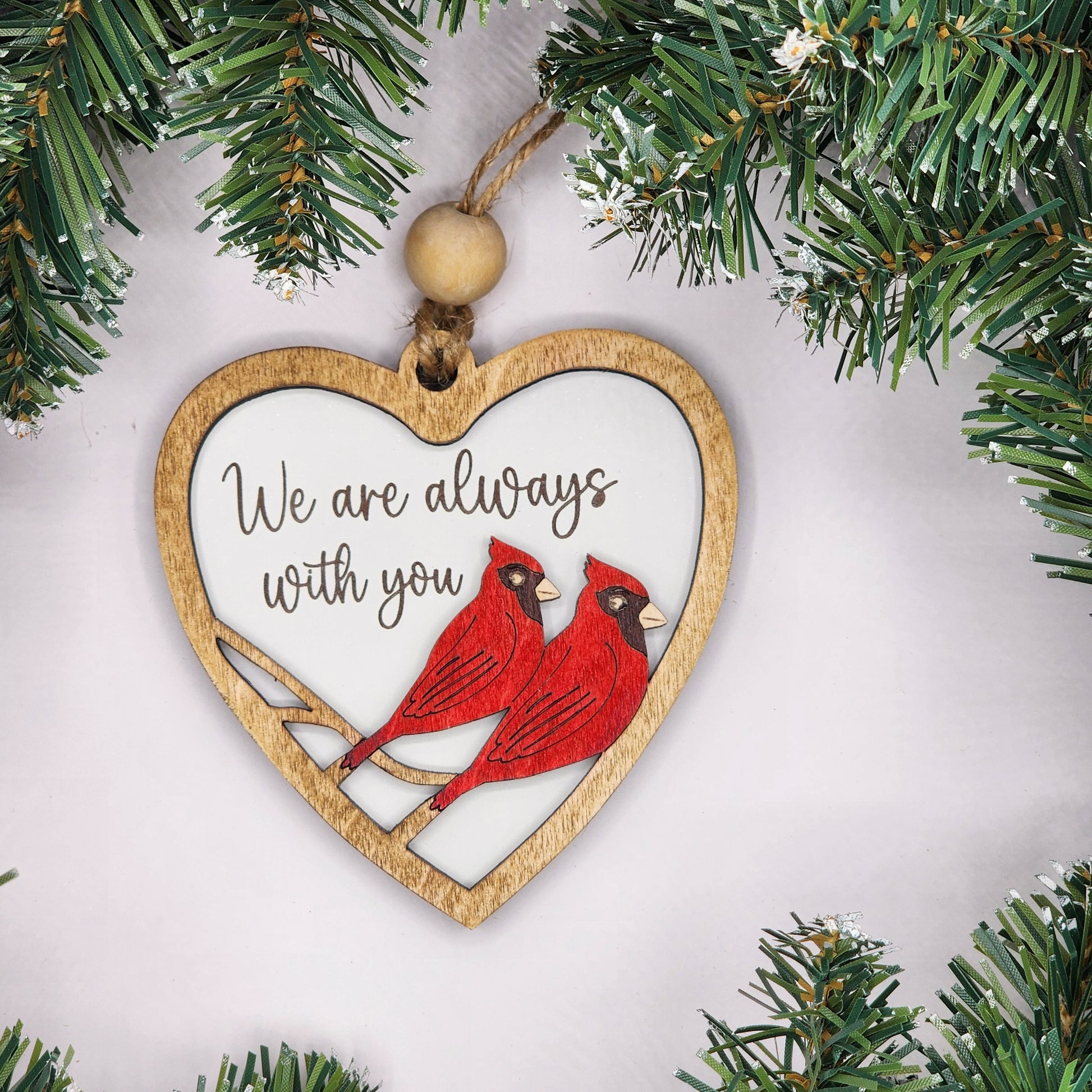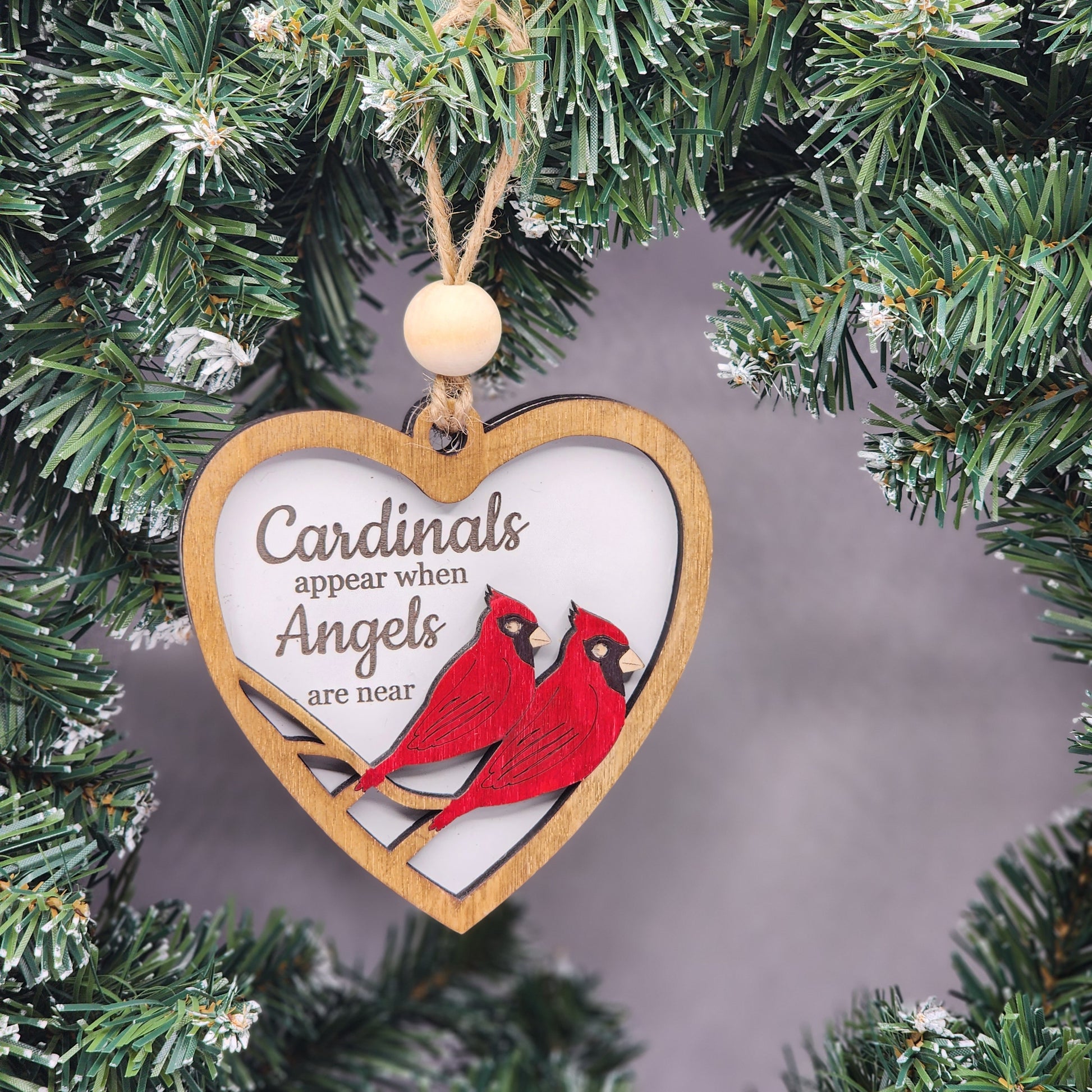 A handmade memorial ornament with the option of having it say “I am always with you” or “Cardinals appear when angels are near". This is a way to celebrate the life of a loved one and would make a thoughtful gift for someone who may have lost someone close to them. They say that Cardinals can remind you of a departed loved one and are known as the most notable messenger. The ornament is laser cut, engraved, and lightly sanded to give a clean look. The Cardinal is red and the rest of the front face is stained with a mission oak. The back plate is made of white board.