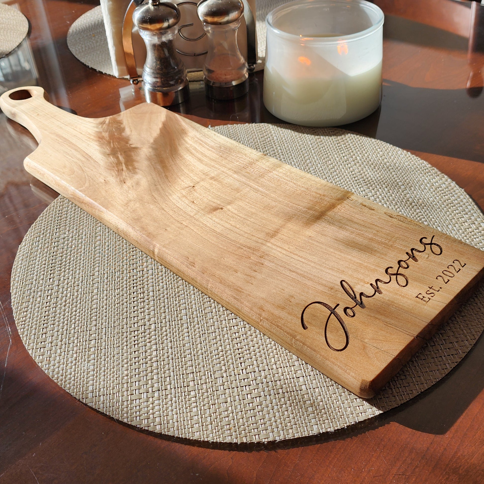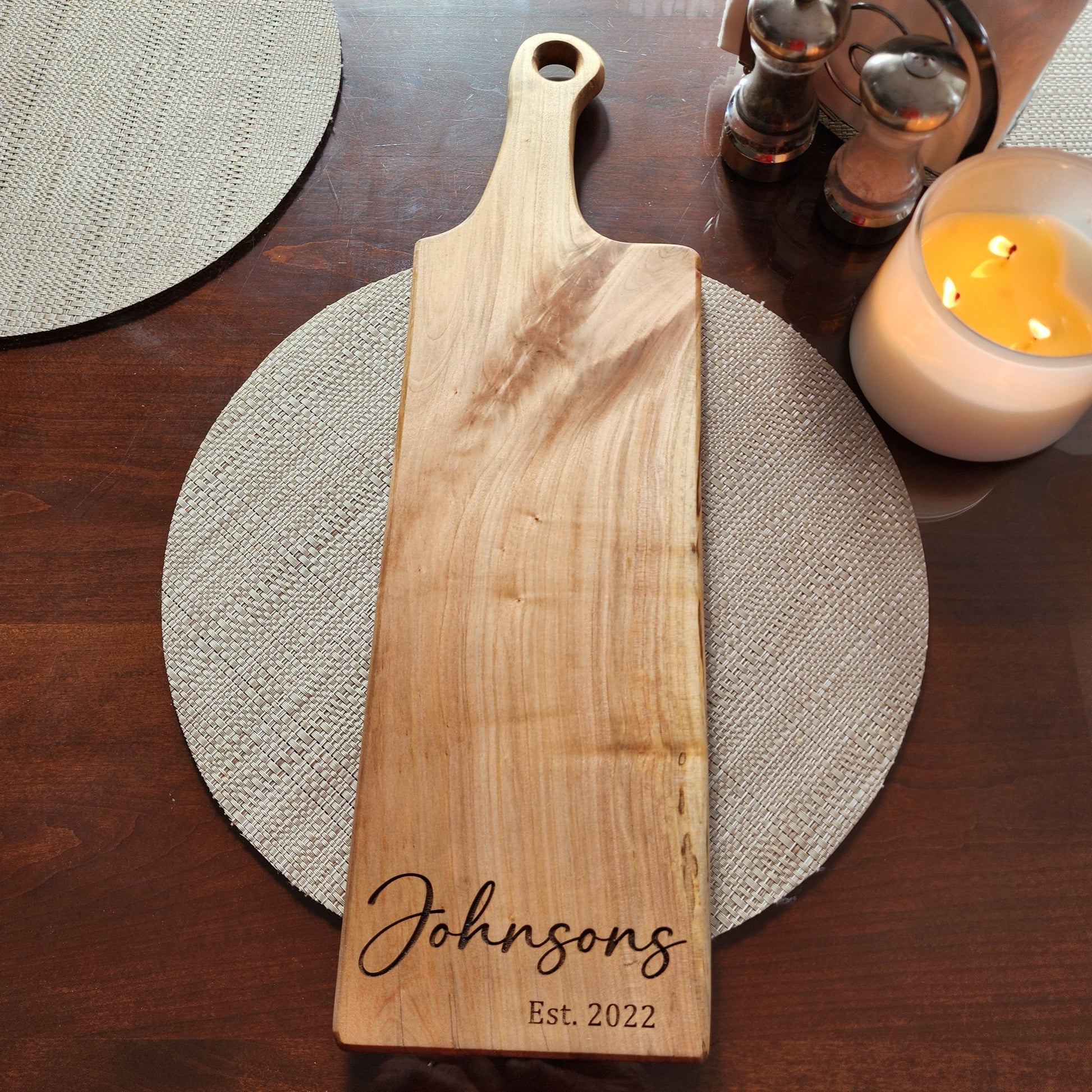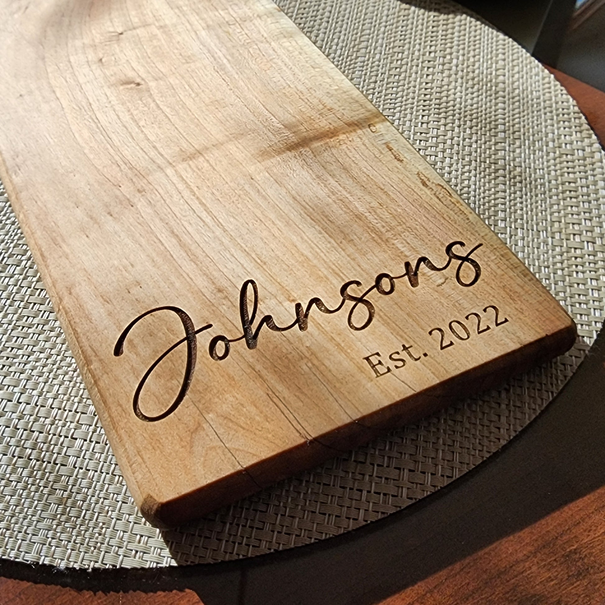 Presenting a stunning handmade charcuterie board crafted from exquisite maple wood and meticulously engraved for perfection. With dimensions measuring 20 inches in length (including the handle) and 6 inches in width, this board is an ideal gift for weddings, anniversaries, or any special occasion. These boards are cut out with a cnc machine sanded to perefection and then engraved. It's important to note that each cutting board is crafted from distinct wood, making each piece unique. Due to the natural variations in the wood, some boards may exhibit slightly lighter or darker engravings compared to the photo. The boards should be hand washed and never put in a dishwasher. There will be a picture for you to select which design option you want for your board.